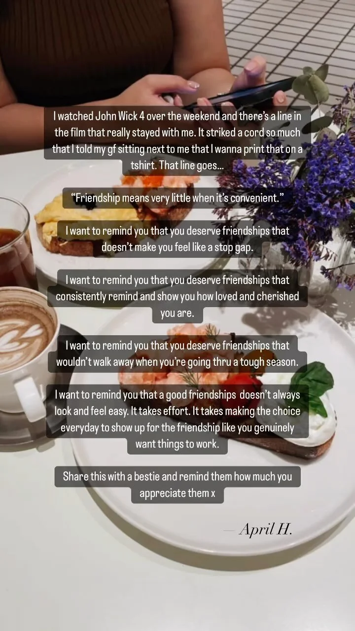 “April, you've given me a safe space to be vulnerable, to trust that I will not be judged, to guide me through everything when I don't have the words for it. You are my translator to feelings and thoughts that I've never known how to express.”